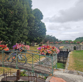 Today was probably the easiest long ride I've ever had in my life: 76 pancake-flat miles on a paved and protected bike path along rivers, canals, bridges, and even a canal routed across a bridge, with cool breezes and a light drizzle, punctuated with two delicious vegetarian plates at restaurants. Ah, the good life.